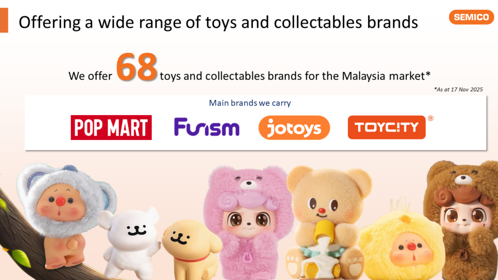 We offer toys and collectables sourced from various brands and manufacturers.We currently only supply to retailers (toy stores, hobbyist stores, specialised convenience stores) throughout Malaysia.